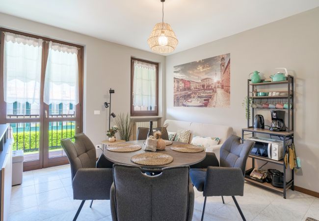 Acogedor apartamento de dos habitaciones ubicado en el complejo residencial Gardenia de Lazise, a aproximadamente 1.2 km del centro de Lazise (15 minutos a pie) y 1.5 km de la playa. El íntimo contexto residencial de solo 8 unidades cuenta con piscina (período de apertura garantizado del 15/05 al 30/09) y una amplia zona verde. El apartamento completamente renovado se abre a una acogedora zona de estar con vista a la piscina y a la terraza amueblada con mesa, sillas y toldo. La sala de estar cuenta con cocina con refrigerador, congelador, horno, cocina de gas, lavavajillas, tostadora, cafetera americana y cafetera de cápsulas. Rincón de descanso con TV satelital, conexión wifi gratuita, aire acondicionado y cómodo sofá cama matrimonial. Baño moderno con cabina de ducha y secador de pelo a disposición de los huéspedes. Amplio armario con vestidor y despensa. La habitación matrimonial, con acceso directo al jardín posterior sombreado amueblado con sombrilla y tumbonas, cuenta con amplio armario y cama con dosel. Plaza de aparcamiento cubierta en garaje. Bodega con lavandería y dos bicicletas a disposición de los huéspedes. Apartamento para no fumadores, no se admiten mascotas. Recomendamos este apartamento para parejas o familias que busquen un alojamiento moderno en un pequeño entorno cerca del centro histórico de Lazise.