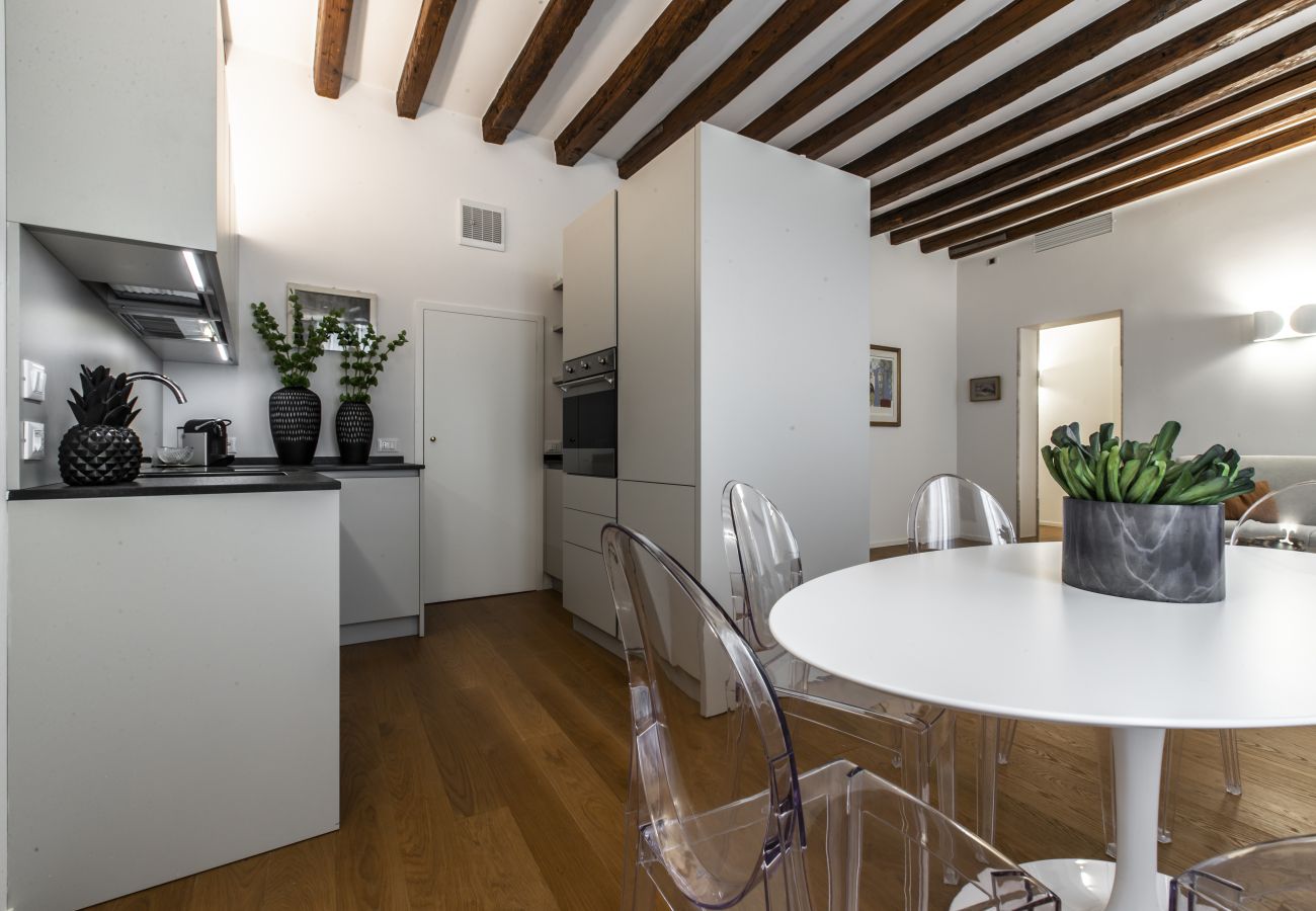 En el interior de un palacio histórico ubicado cerca de la Piazza San Marco, este fascinante apartamento le cautivará por su atmósfera. Bastará con abrir las ventanas para admirar el paso de las góndolas en el canal inferior.