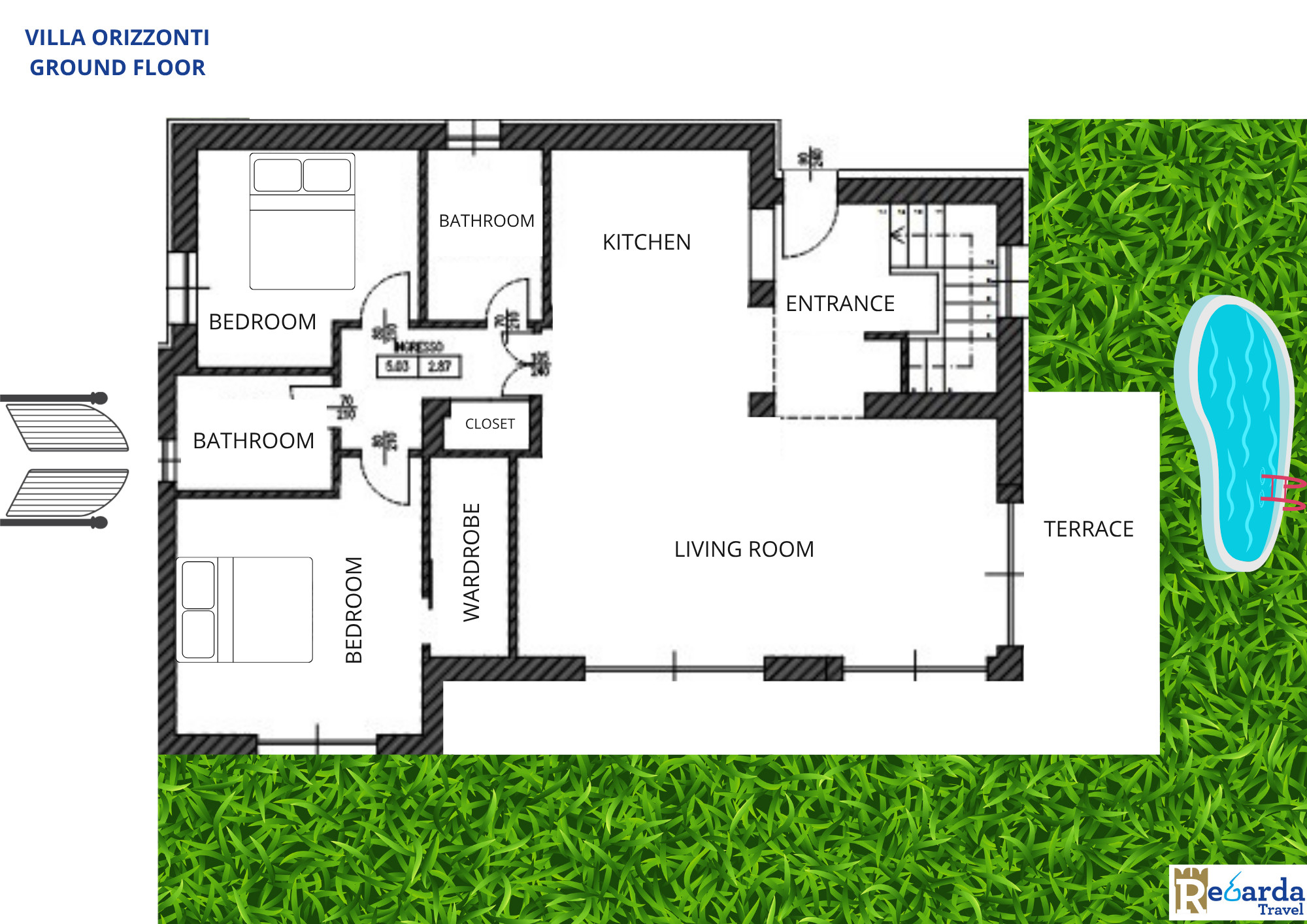 La planta baja de Villa Orizzonti acoge el área de estar, además de una cocina completamente equipada con placa de inducción, horno, microondas, frigorífico con congelador, lavavajillas, cafetera y tostadora. El salón con vista panorámica a la zona de la piscina, al jardín de 600 m² y al lago está amueblado con un gran sofá y un smart TV (sin satélite). La zona de comedor con librería y mesa de cristal puede acoger hasta 8 personas. En el exterior se encuentran un jardín mediterráneo y una terraza cubierta para cenas y almuerzos al aire libre. La piscina privada es ideal para relajarse y regenerarse del estrés, también hay un área de solárium con tumbonas y sombrilla (período de apertura garantizado 15/05-30/09).