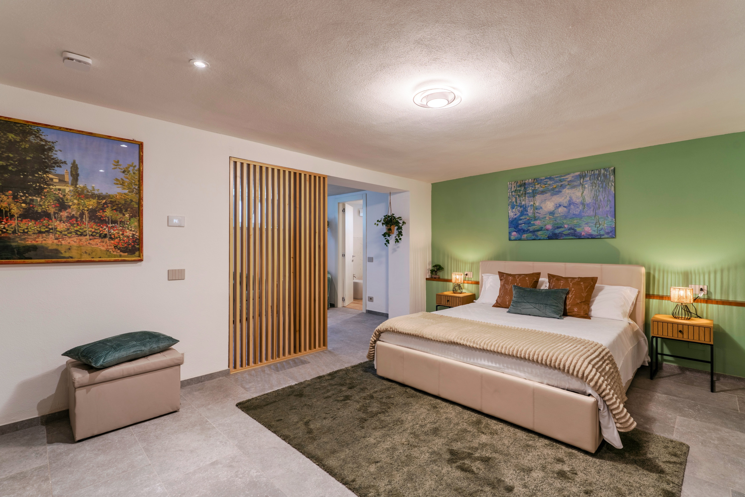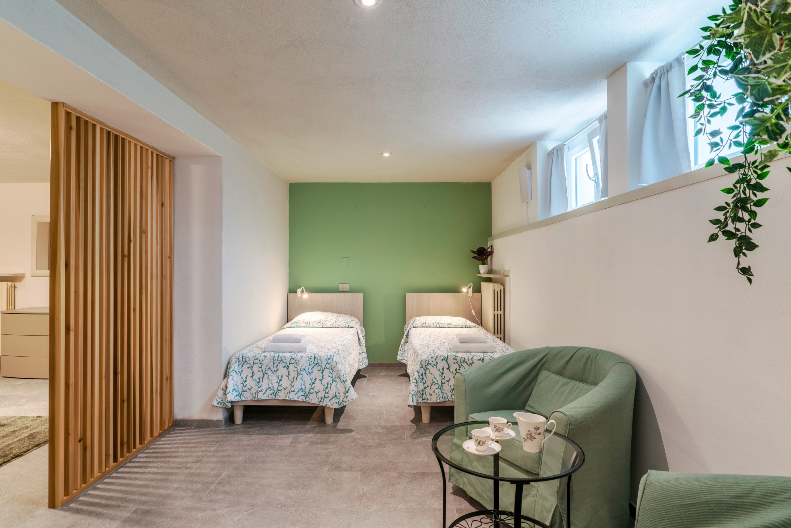 La planta sótano está reservada a la Family Suite, amplia habitación con una cama de matrimonio y dos camas individuales, separadas por una pared de madera para garantizar mayor privacidad. También hay un tercer baño con ducha a disposición de los huéspedes.