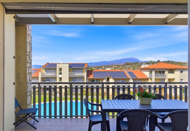 Endroit très calme et facile d'accès avec garage privé sur la propriété, piscine (non chauffée), ascenseur, tout était parfait et l'équipement était suffisant pour les vacances et même mieux. La vue sur les montagnes d'un côté et les vignes de l'autre.