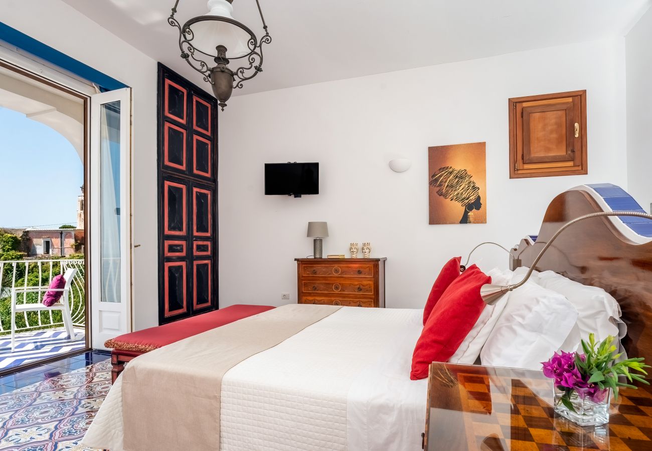 • Sunrise Suite con bagno privato con vasca idromassaggio: questa lussuosa suite dispone di un'ampia terrazza privata di circa 40 mq che si affaccia sulla splendida baia di Amalfi. La Sunrise Suite p dotata di un'area salotto vista mare, separata dalla camera da letto per maggiore privacy e comfort, corridoio in pietra e bagno con vasca idromassaggio. I mobili sono opere uniche della tradizione napoletana; il pavimento in cotto antico e la maiolica verde mare in stile vietrese rendono questa suite la più prestigiosa della villa. Su richiesta, possibilità di due letti aggiuntivi.