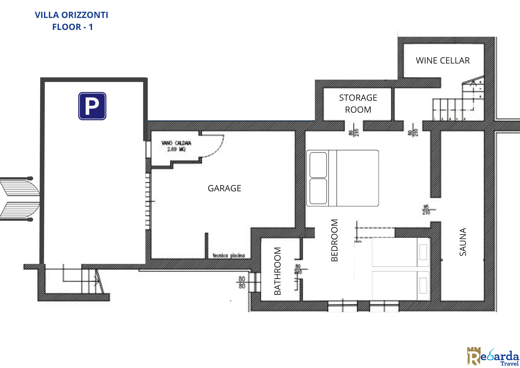 The ground floor of Villa Orizzonti houses the living area, as well as a fully equipped kitchen with an induction hob, oven, microwave, refrigerator with freezer, dishwasher, coffee machine and toaster. The living room with a panoramic view of the pool area, the 600 sqm garden and the lake is furnished with a large sofa and a smart TV (no satellite). The dining area with bookshelf and glass table can accommodate up to 8 people. Outside there is a Mediterranean garden and a covered terrace for outdoor dinners and lunches. The private pool is ideal for relaxing and regenerating from stress, there is also a solarium area with sunbeds and parasol (opening period guaranteed 15/05-30/09).
